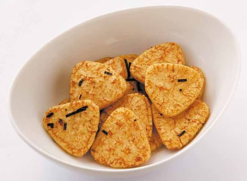 这些香脆的酱油味米饼形状像三角形饭团,带有淡淡的鲣鱼香味。