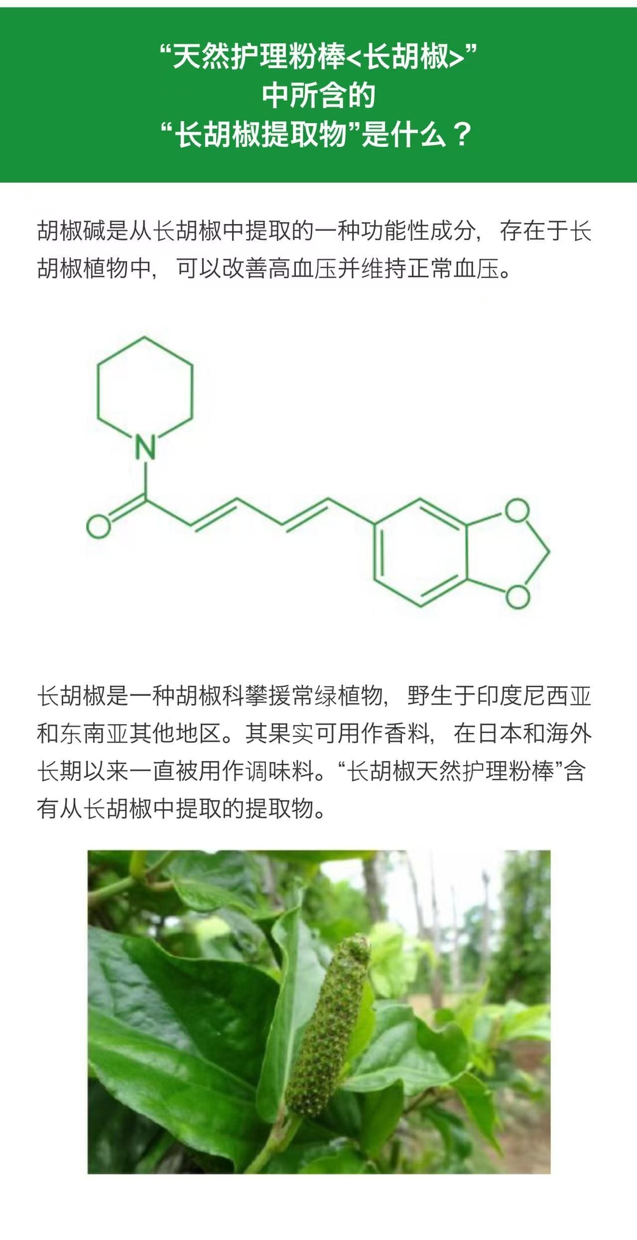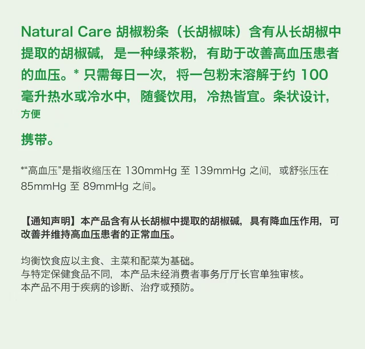 ● 天然呵护 长胡椒粉条是一款功能性绿茶粉,含有源自长胡椒的功能性成分“胡椒碱”,有助于改善高血压*并维持正常血压。
