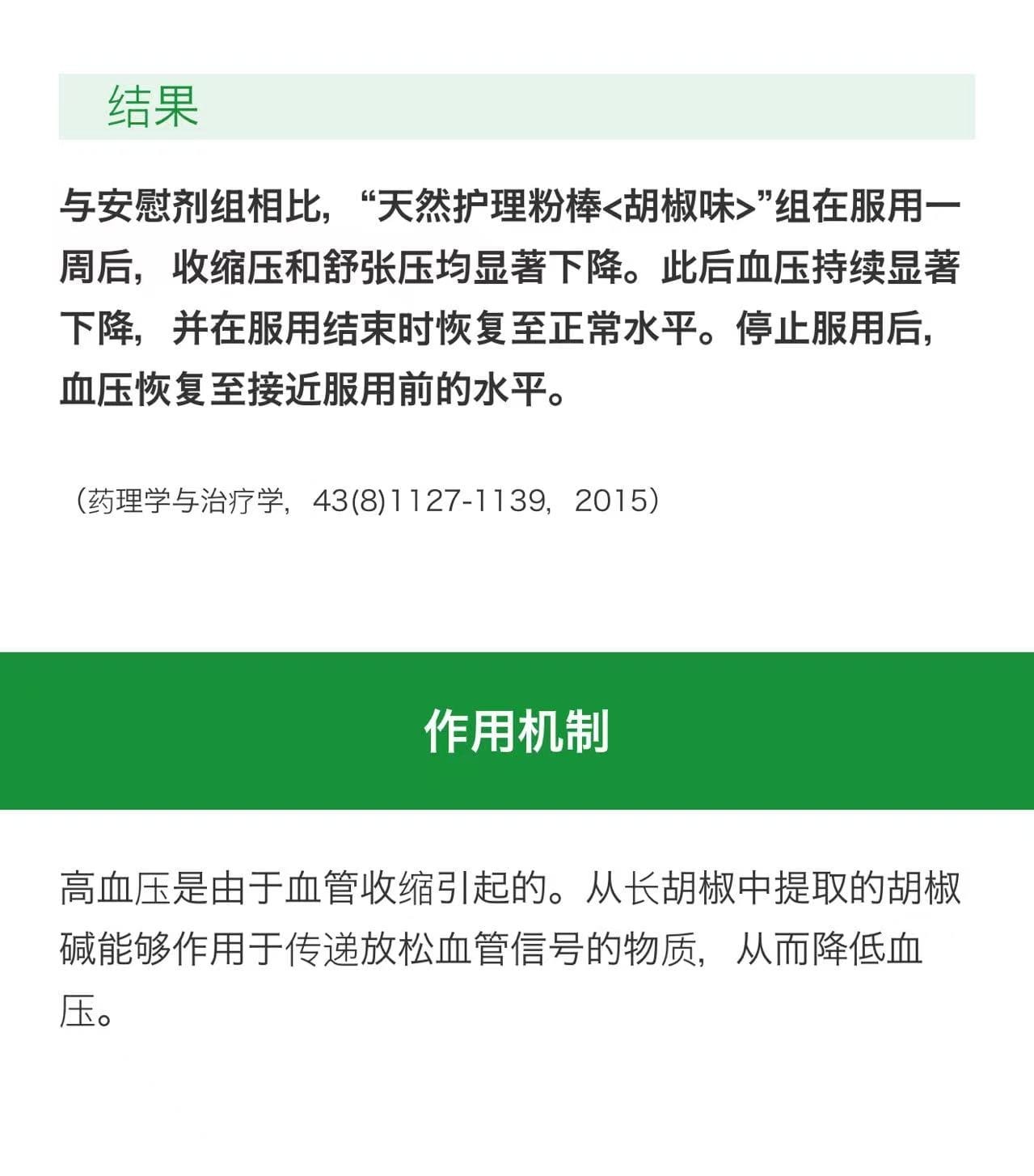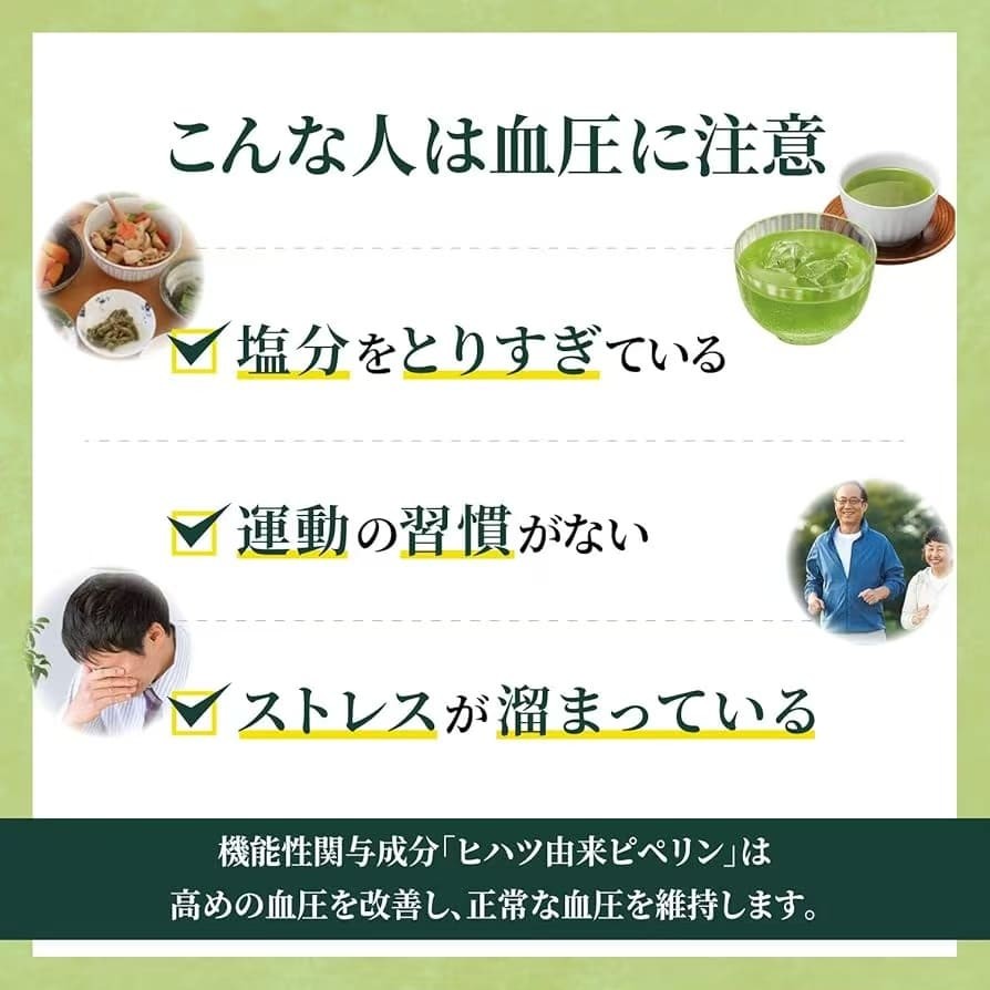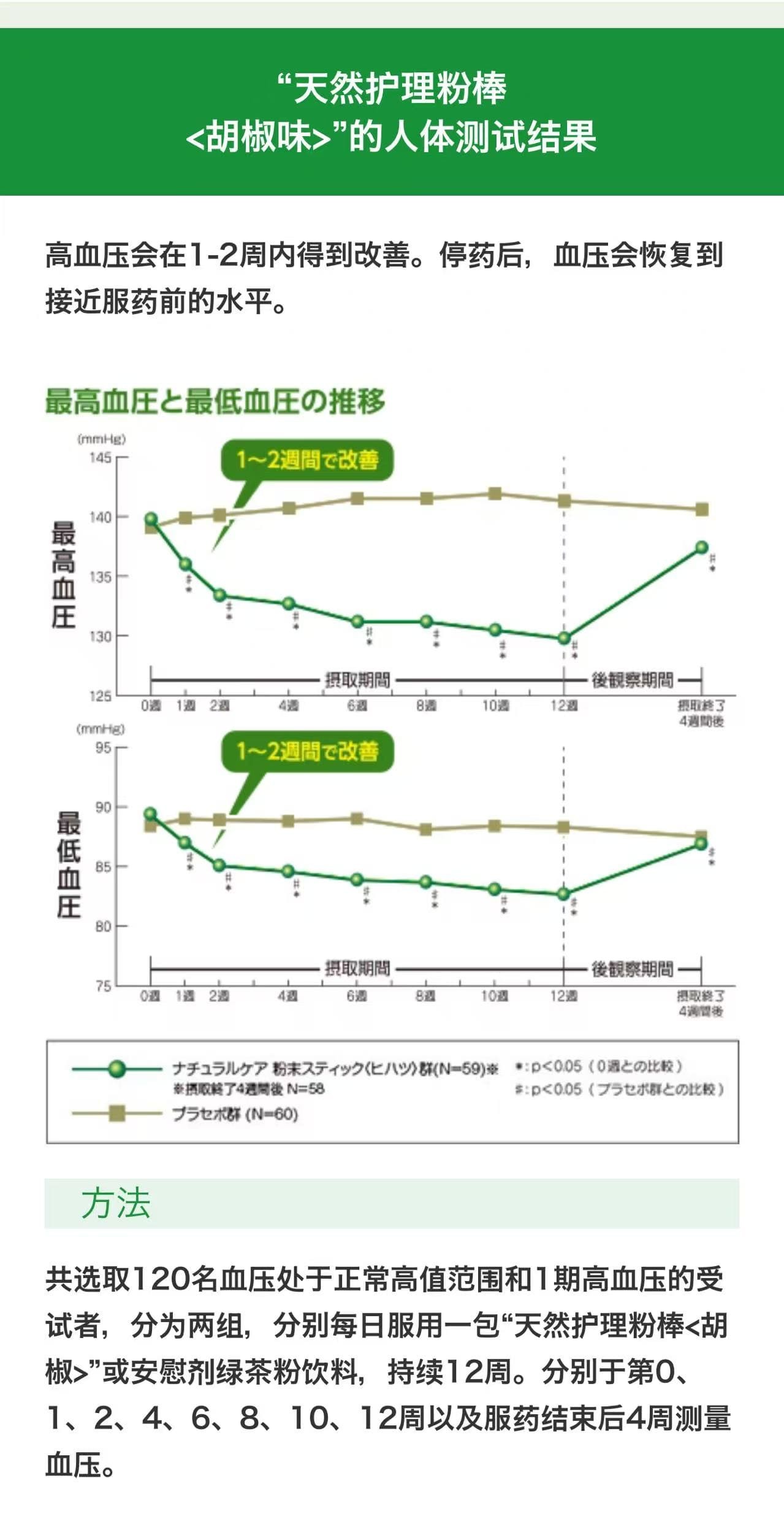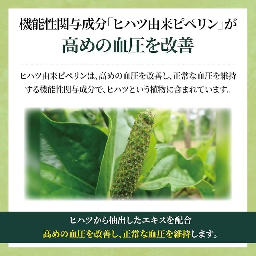 本产品含有源自长胡椒的胡椒碱,具有降低血压的功效,有助于改善和维持高血压患者的正常血压。