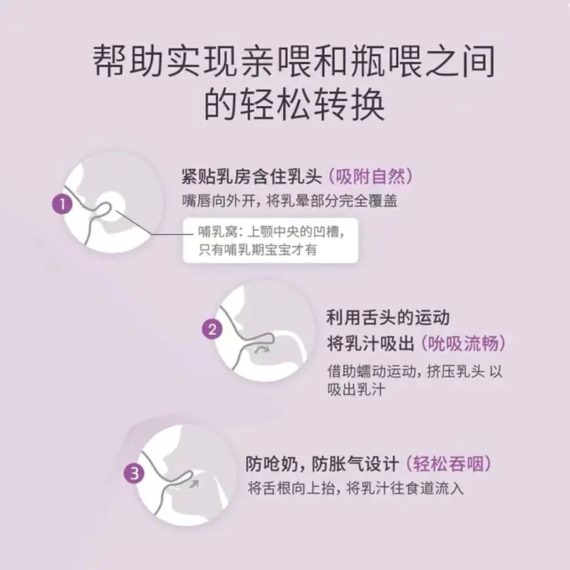 宽口径奶嘴通气阀,吸吮柔软舒适顺畅,自然实感。