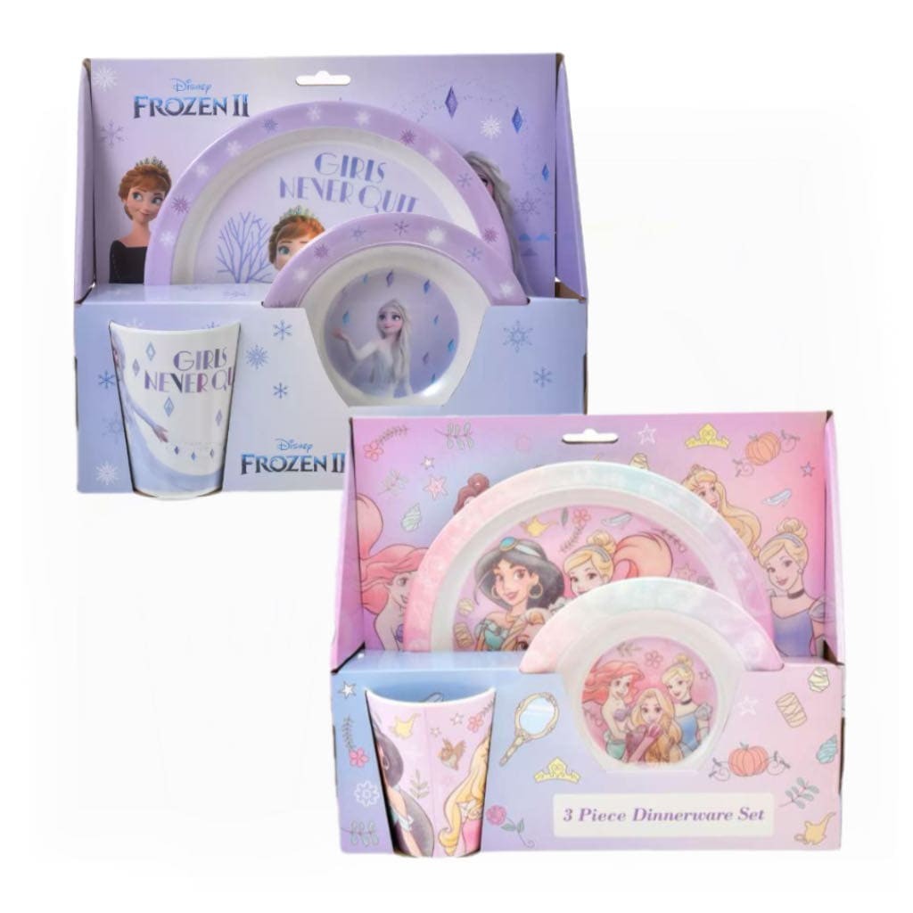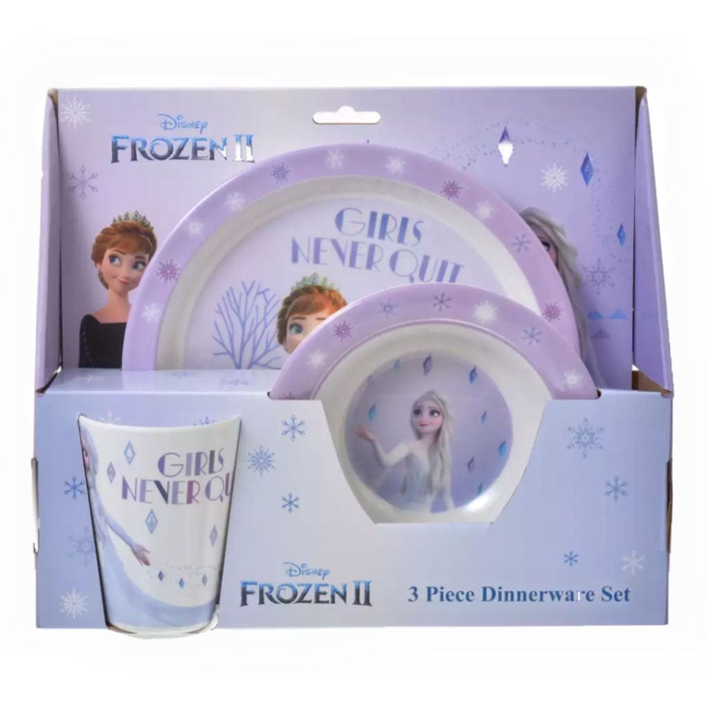 冰雪奇缘2款:与《冰雪奇缘 2》中的艾莎和安娜一起设计。推出一套盘子、碗和杯子。上面印有人物和雪花的设计。盘子和碗都装饰有闪光。餐具的另一个优点是不易破损、重量轻且易于清洁。
