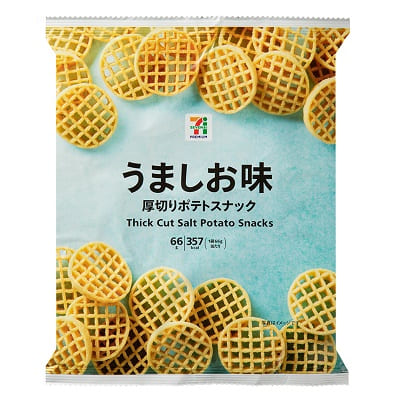 这款炸土豆厚切片厚,超脆的!面团中加入了鲣鱼片提取物粉、海带粉、香菇粉等三种鲜味成分,营造出浓郁的风味,并添加了两种盐,以衬托出土豆的风味。通过将面团做成网状,即使切成厚片,也能享受到香脆的口感。