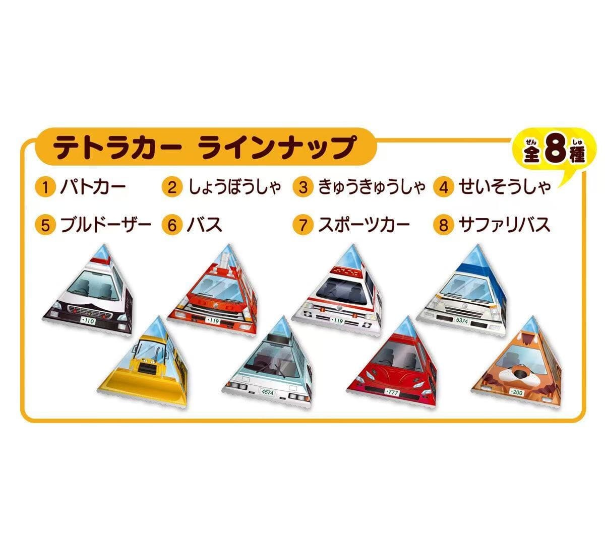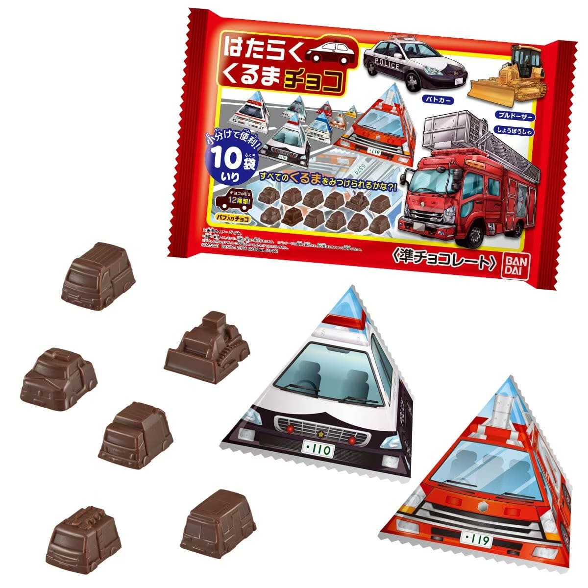 巧克力造型共有12种不同的工作车辆款式。主要描绘的车型包括警车、推土机和消防车。