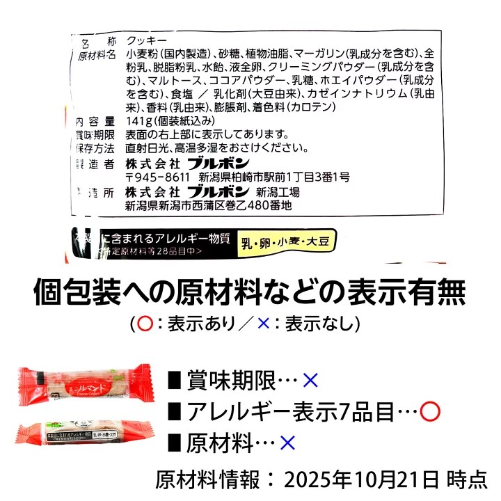 产品原料:小麦粉(国产)、白砂糖、植物油、人造黄油(含乳制品成分)、全脂奶粉、脱脂奶粉、淀粉糖浆、液态全蛋、奶油粉(含乳制品成分)、麦芽糖、可可粉、乳糖、乳清粉(含乳制品成分)、盐/乳化剂(大豆来源)、酪蛋白酸钠(牛奶来源)、调味剂(牛奶来源)、膨松剂、着色剂(胡萝卜素)