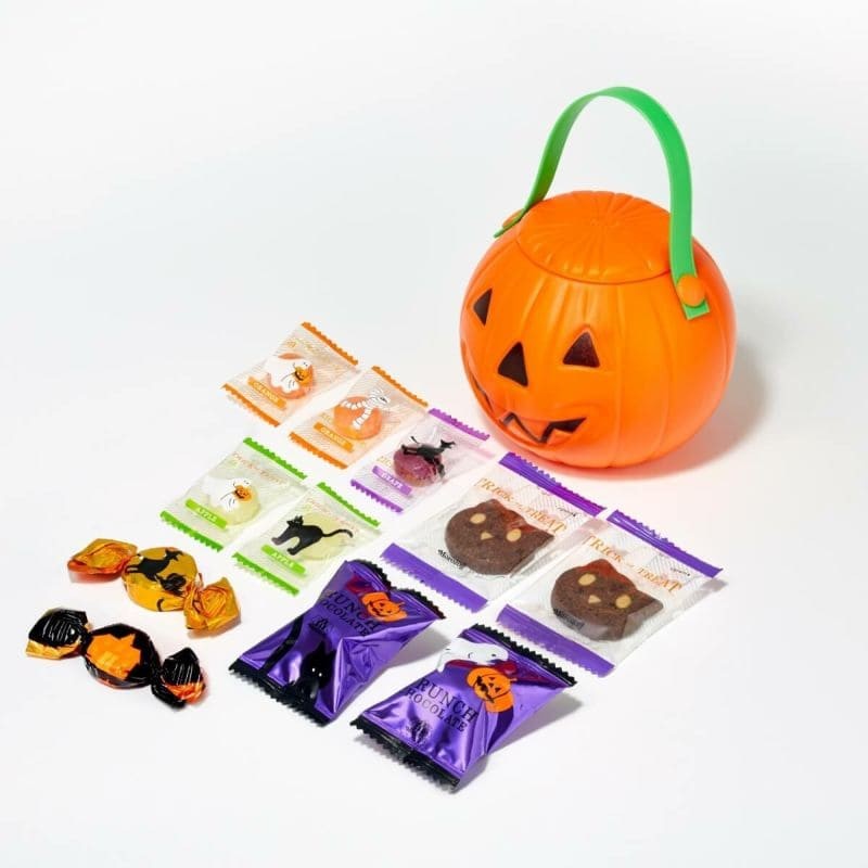 南瓜灯笼容器中装满了各种巧克力、脆巧克力、巧克力饼干和糖果,非常适合万圣节季节。包装盒也有有趣的万圣节设计!吃完糖果后会可以改造成一个可爱的糖果容器或者小灯笼!