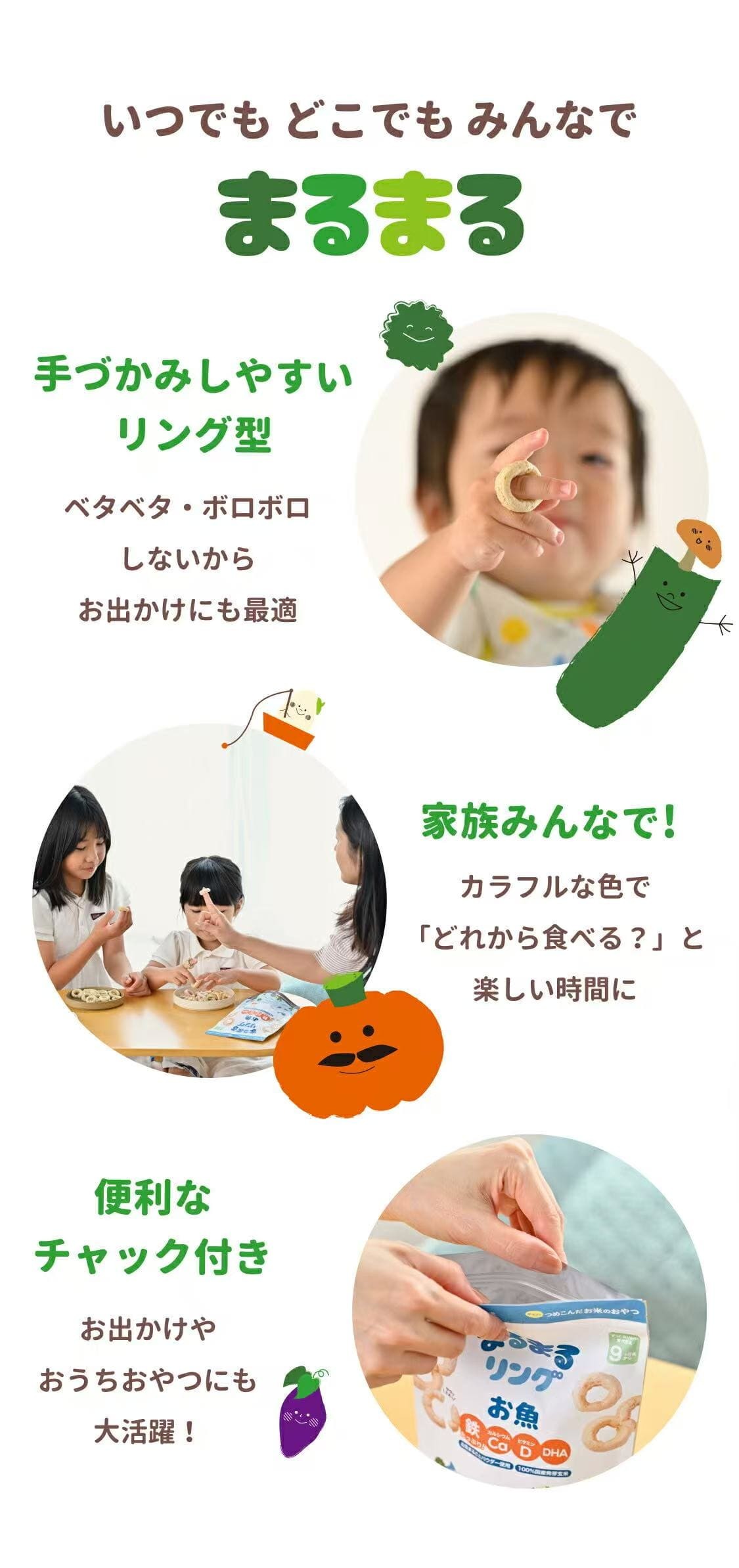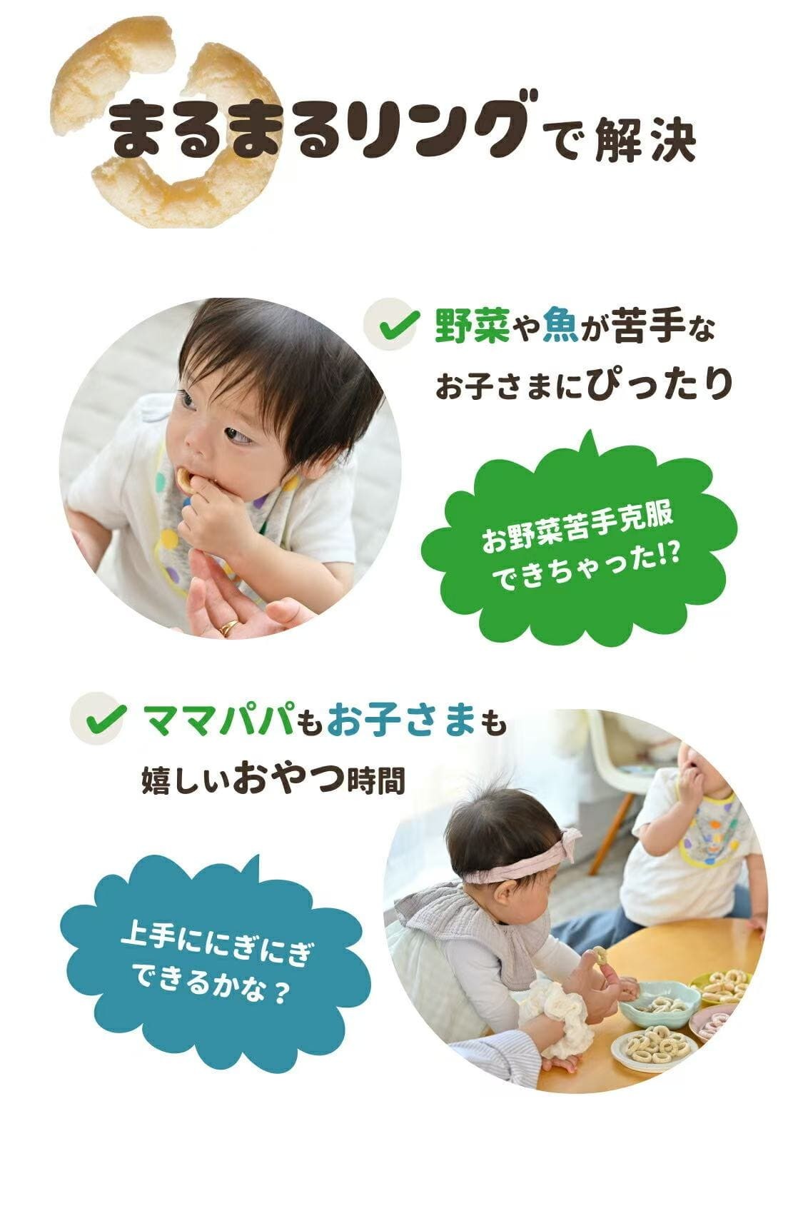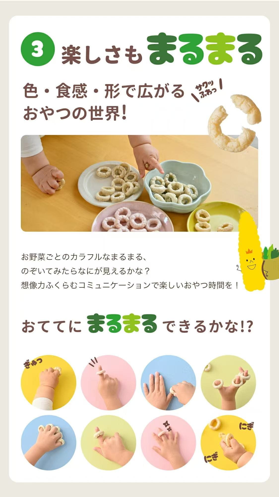 这些环形米饼含有日本产越光米和蔬菜。考虑到宝宝经常缺乏的营养素,这三种颜色和口味鼓励宝宝自己进食的欲望。