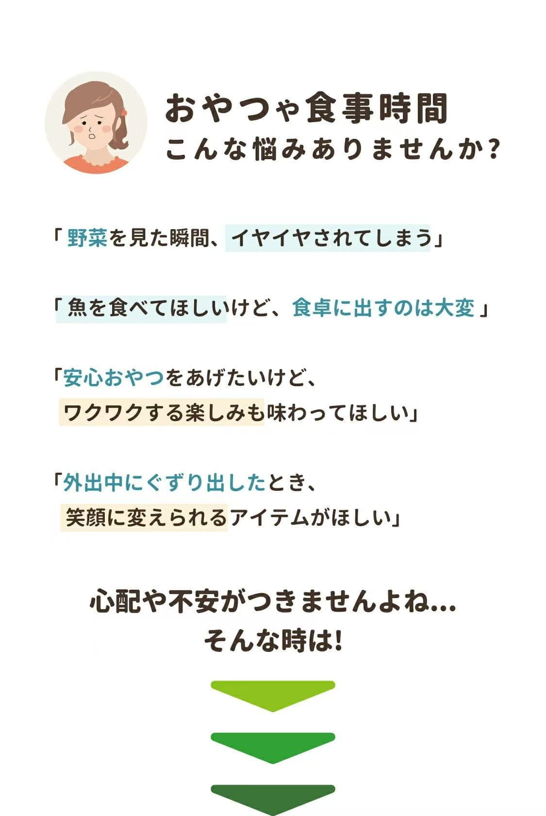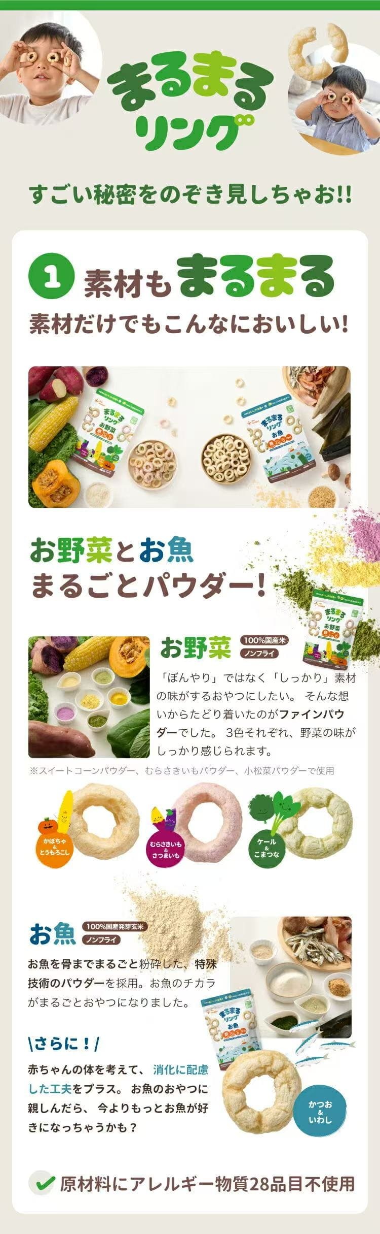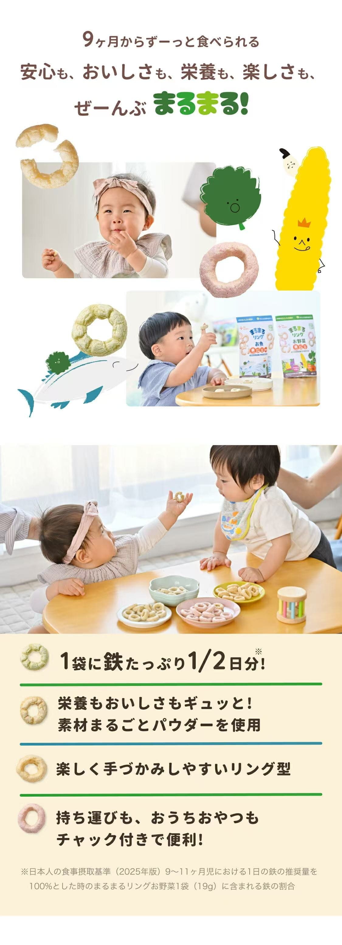 这些环形米饼含有日本产越光米和蔬菜。考虑到宝宝经常缺乏的营养素,这三种颜色和口味鼓励宝宝自己进食的欲望。