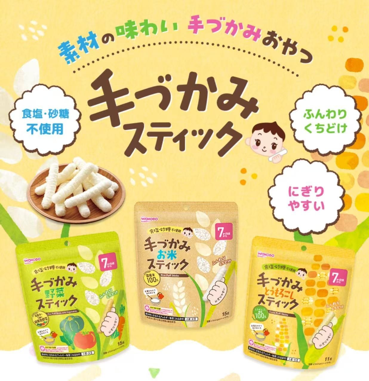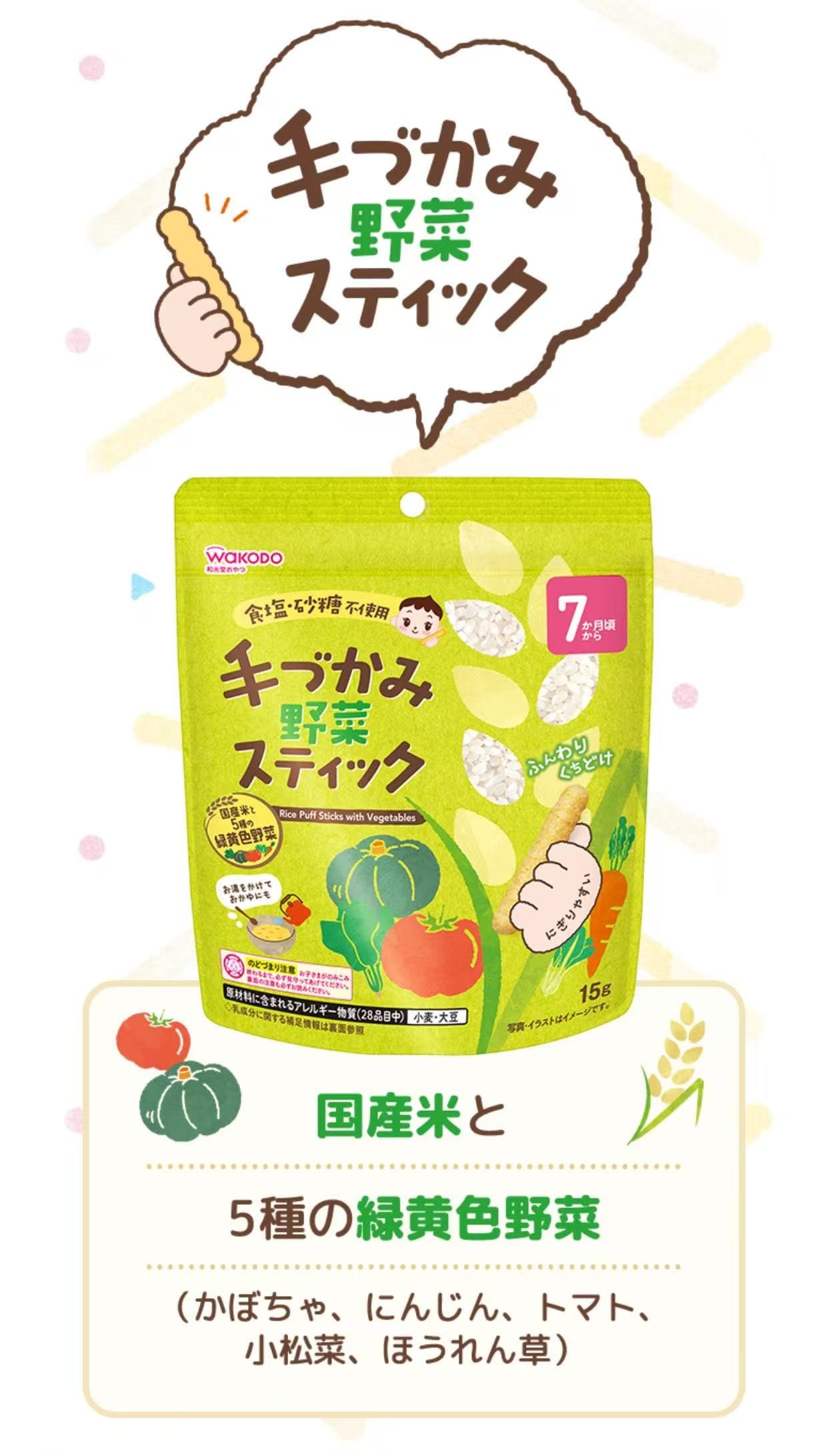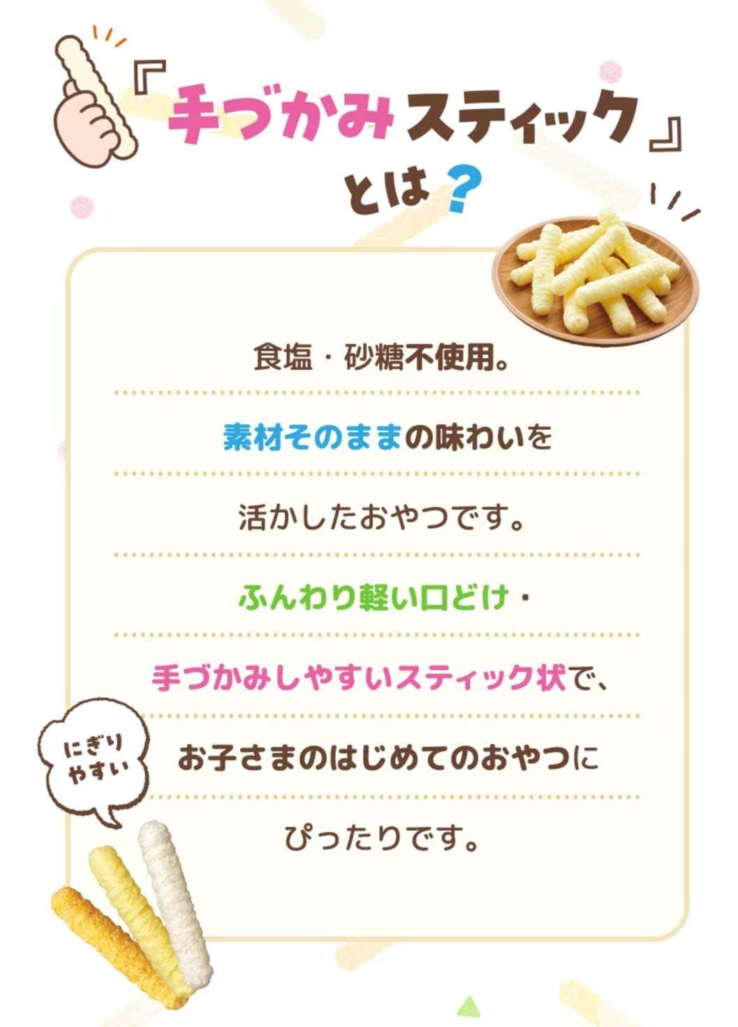 采用自产大米和五种黄绿蔬菜制成。这款无盐无糖的零食,让您尽享食材的天然美味。口感轻盈蓬松,入口即化,棒状设计方便孩子们用手抓取。