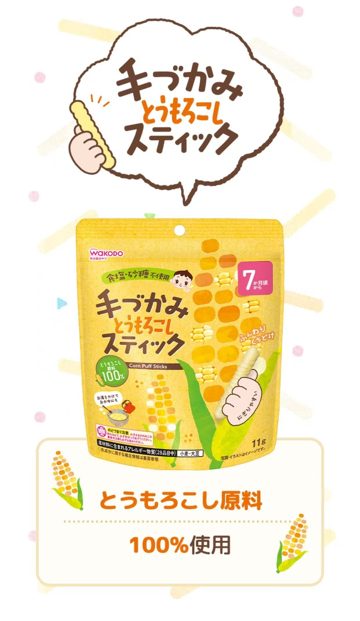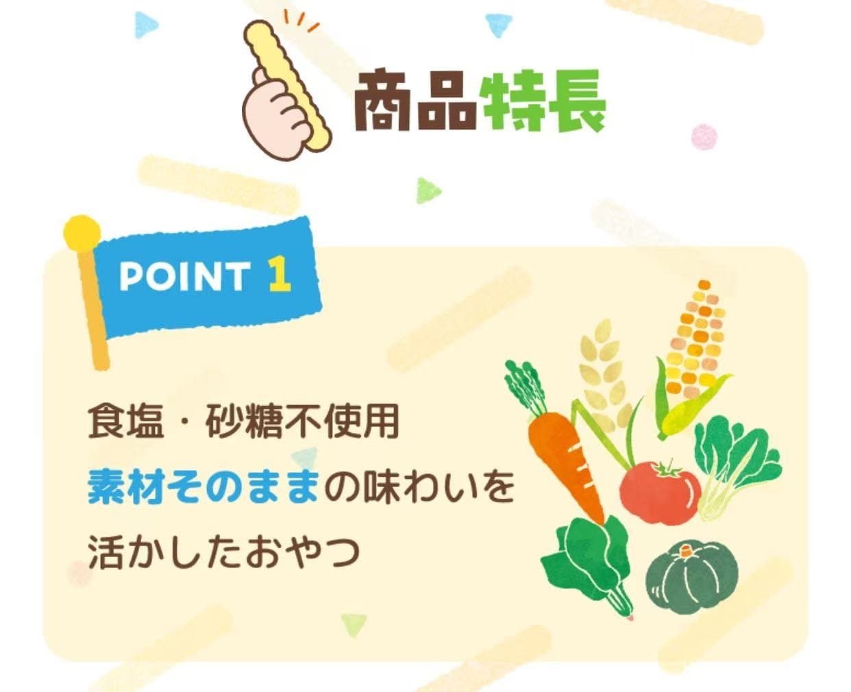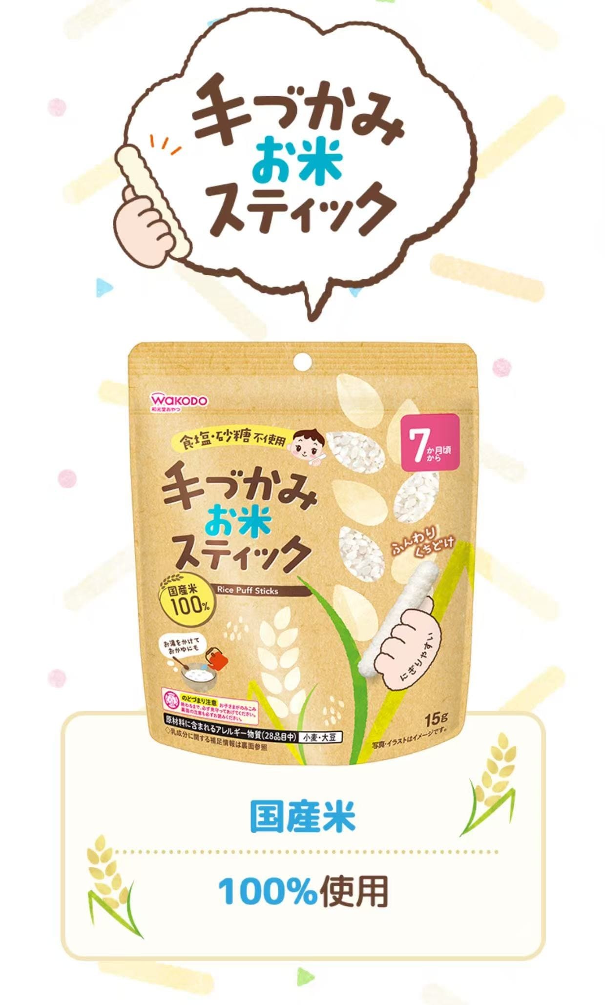采用自产大米和五种黄绿蔬菜制成。这款无盐无糖的零食,让您尽享食材的天然美味。口感轻盈蓬松,入口即化,棒状设计方便孩子们用手抓取。