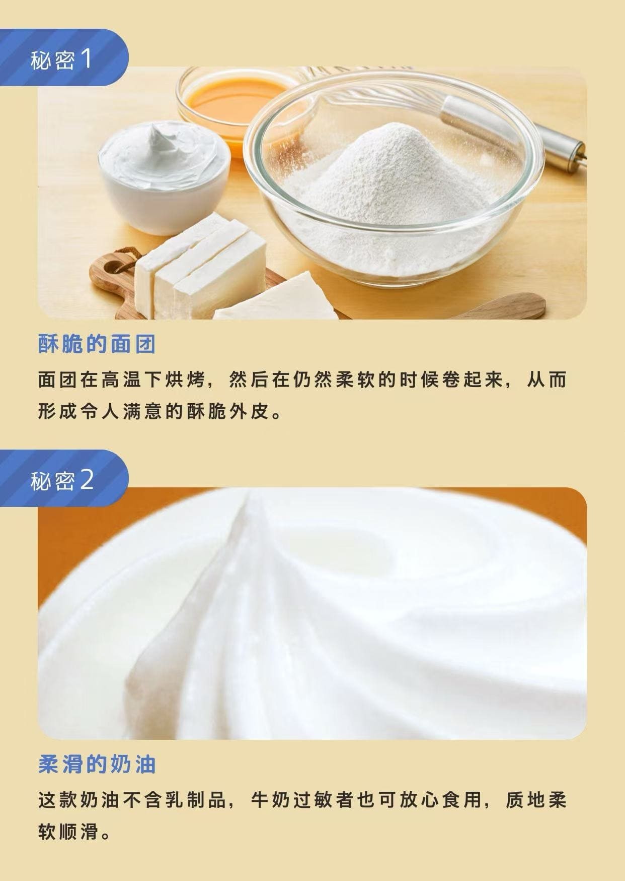 产品原料:小麦粉(国产)、白砂糖、起酥油、鸡蛋、人造黄油、玉米淀粉、麦芽糖、葡萄糖、朗姆酒/膨松剂、乳化剂、调味料(含小麦、鸡蛋和大豆)