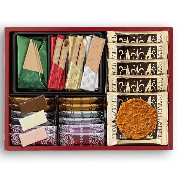 这款什锦巧克力包含质地柔软、轻盈如空气的Ecorce巧克力,含有美味酥脆的杏仁片的Mandelzigel巧克力,以及裹着醇厚牛奶巧克力、白巧克力和草莓巧克力的Chocolat Ecorce巧克力。