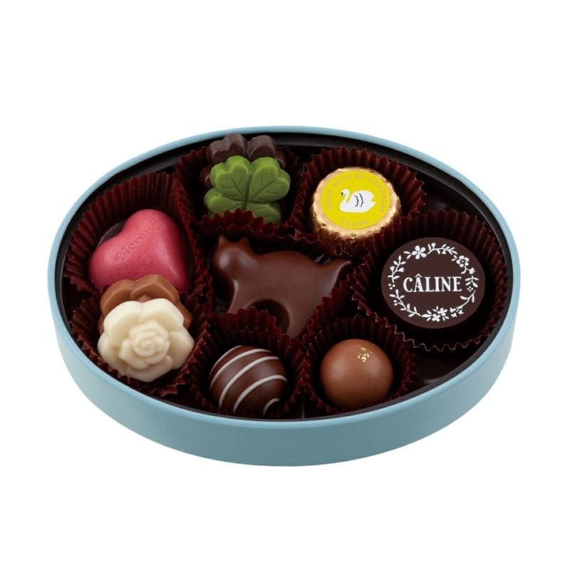 淡蓝色的铁盒包装上印有一只优雅的黑猫,里面装满了心形、玫瑰、猫形巧克力等色彩缤纷的巧克力。有多种口味,包括水果、坚果和咖啡。