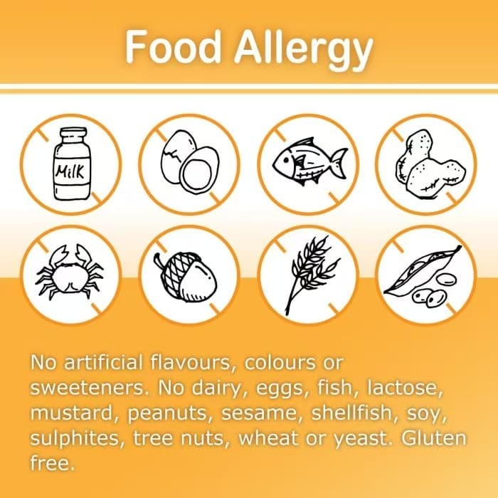 过敏原:不含人工香精、色素或甜味剂。不含乳制品、鸡蛋、鱼类、乳糖、芥末、花生、芝麻、贝类、大豆、亚硫酸盐、树坚果、小麦或酵母。不添加糖、阿斯巴甜、对羟基苯甲酸酯或苯甲酸钠。不含麸质!