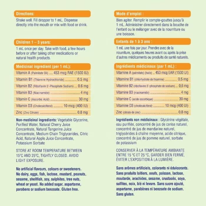 - 适合幼儿和儿童的美味复合维生素液体。专为 1 至 3 岁的幼儿科学配制。维生素 A 有助于保持良好的视力,维生素 B 有助于提供日常能量,维生素 C 有助于提高免疫力,维生素 D3 有助于强健骨骼和牙齿,锌矿物质有助于提高免疫力和食欲